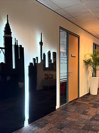 A spacious, classroom-style training room with rows of tablet chairs arranged along a central aisle for clear visibility and smooth movement. The ceiling combines track lights and warm spot lighting to create a focused yet welcoming learning atmosphere. Evo-X branding anchors the front area, while the surrounding open layout allows the space to flex between training sessions, briefings, and team events. A bold city-skyline feature wall at the entrance adds a strong first impression.